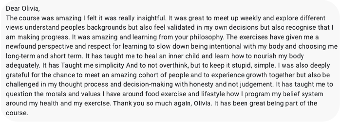 reframing food & nutrition ― the relationship between food & emotions ― Understanding body signals: cravings, tiredness, stress, hunger ― Nourishment over numbers: the art of eating well